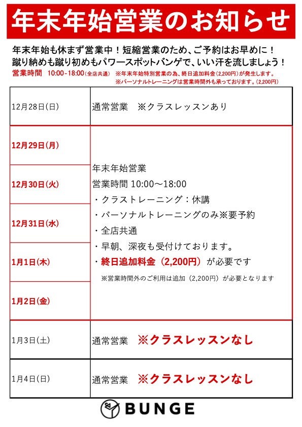 今年の締めくくりに、新年のスタートに、是非バンゲをご利用ください! 皆さまのご来館をスタッフ一同心よりお待ち申し上げております! 年末にさしかかり、これから寒さも増してまいりますのでお身体ご自愛ください。